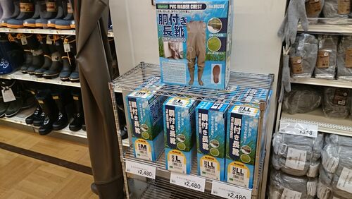 浜からボートを出すときにウェーダーを使ってますが、これでもいいのかもね。カインズホームで見つけました。