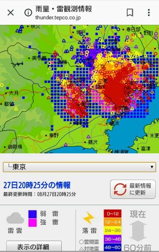 これは酷いな。 東京電力の雨量・雷情報は、このサイトができた頃から愛用しているが、ここまで酷い落雷は見た記憶が無いくらい。 いま、横須賀線で真っ赤な中を駆け抜けてきた。品川から鶴見あたりまで、豪雨と沿線に次々と落雷、怖かった。JR各線、ほぼ平…